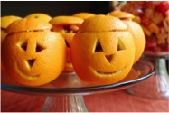 Slice off the top of a navel orange and hollow out the interior by scooping out the orange segments. Carve a pumpkin face on one side of the orange and repeat for other oranges. Dice up your favorite fruit (including the orange segments) and fill each cup. Set the lid back on top and serve.